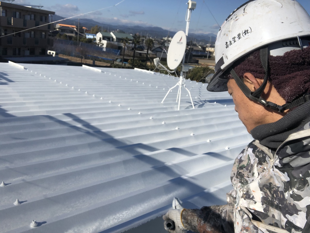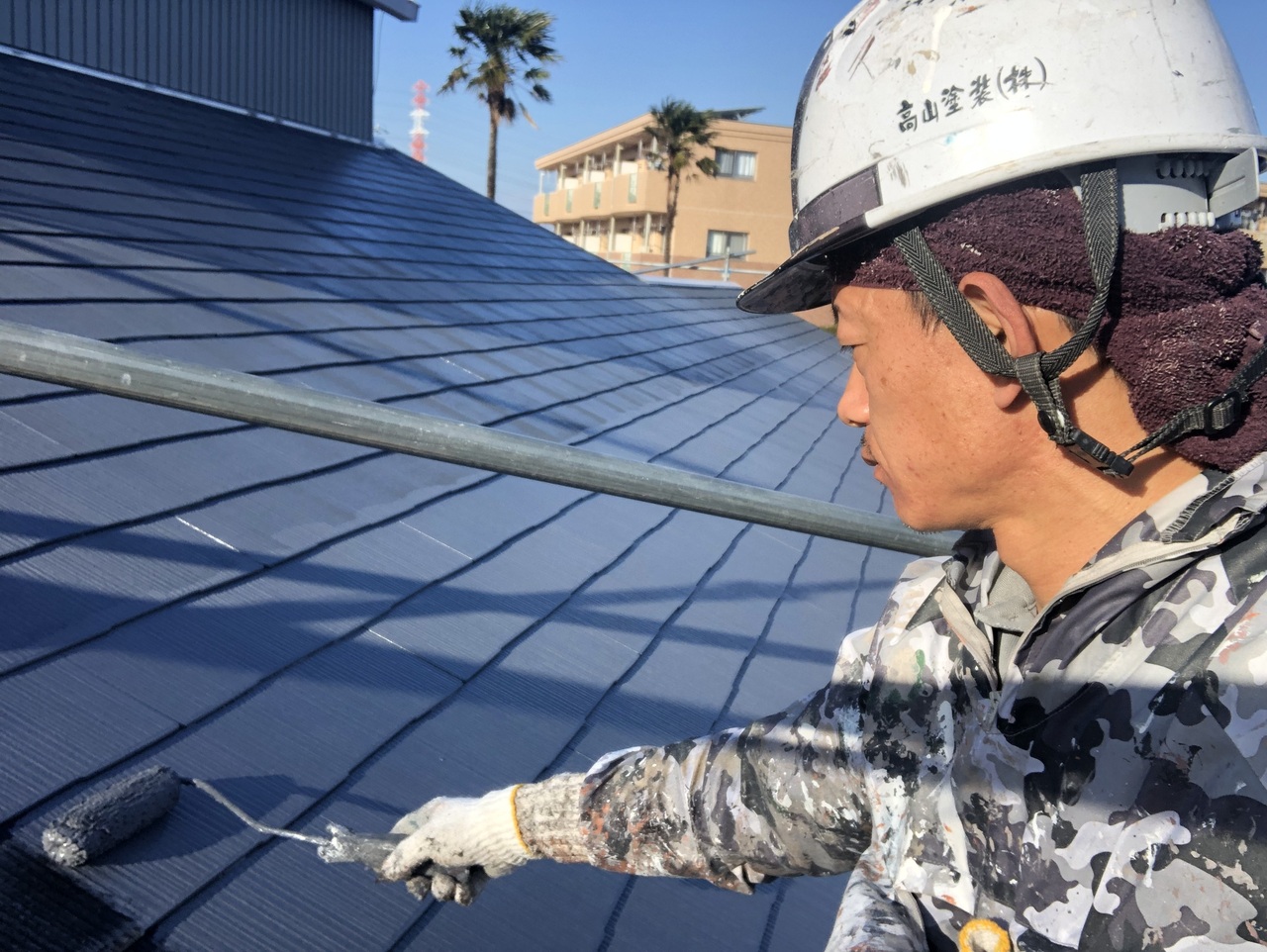 本日池ヶ谷の現場では屋内塗装、社長の現場では塗装まとめ、私の現場では屋根下塗り、各部塗装を行いました。