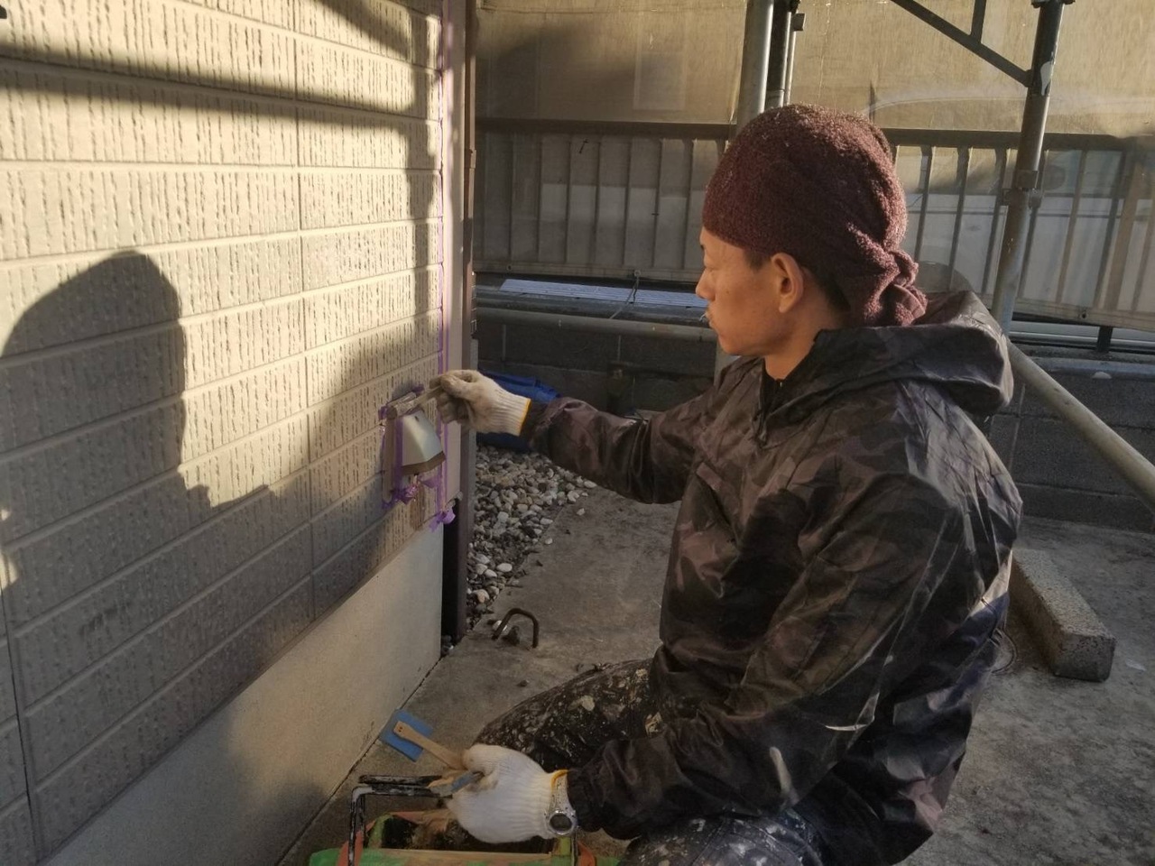 本日社長の現場では各部塗装、屋根下塗り、養生、私の現場では軒天塗装、外壁下塗りを行いました。