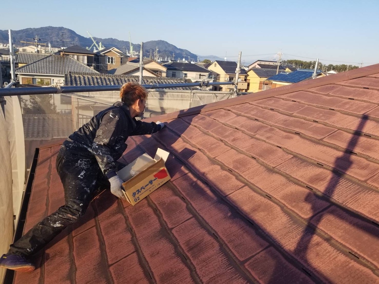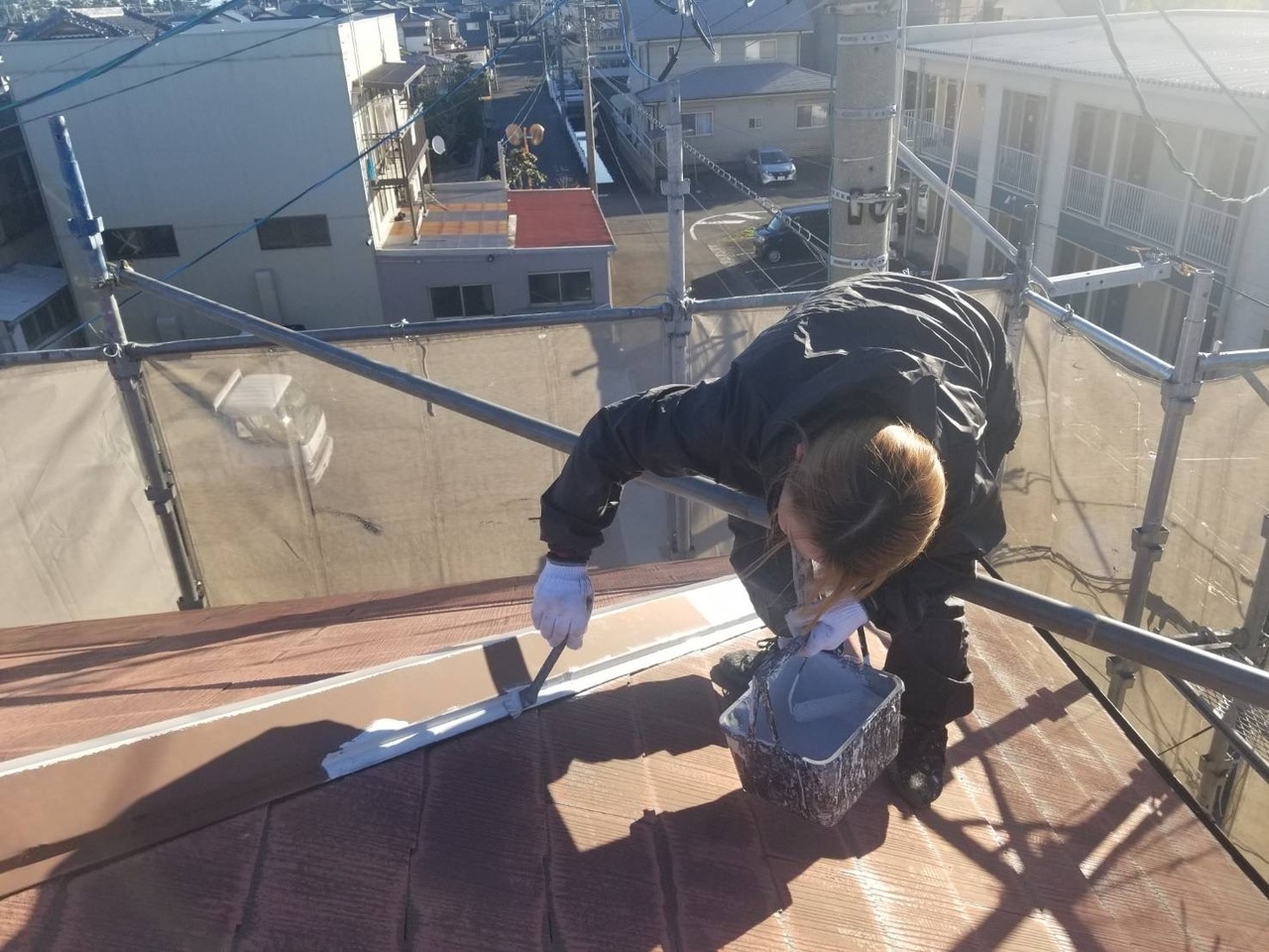 本日社長の現場では軒天塗装、外壁下塗り、屋根中塗り、私の現場では外壁上塗りを行いました。