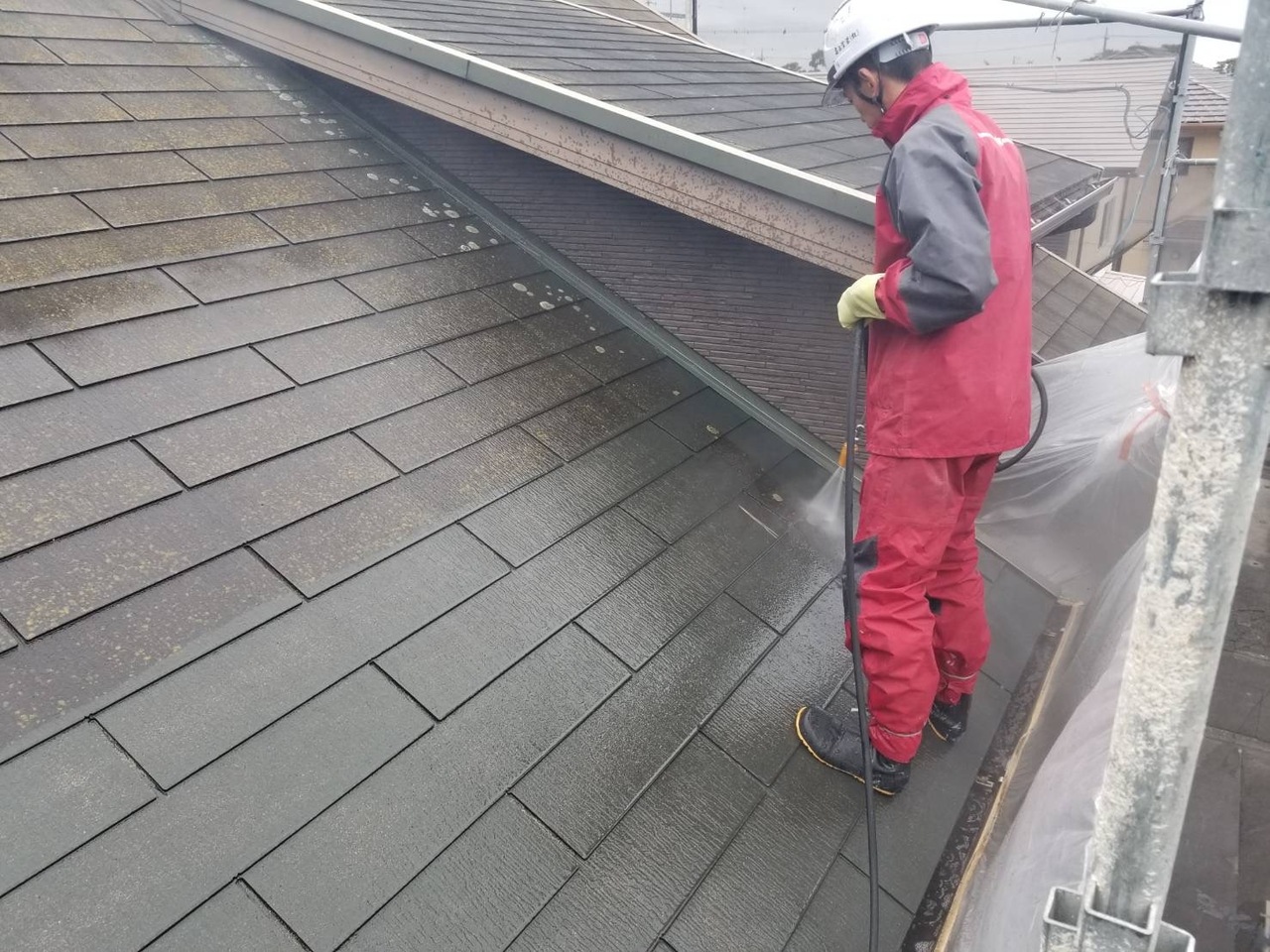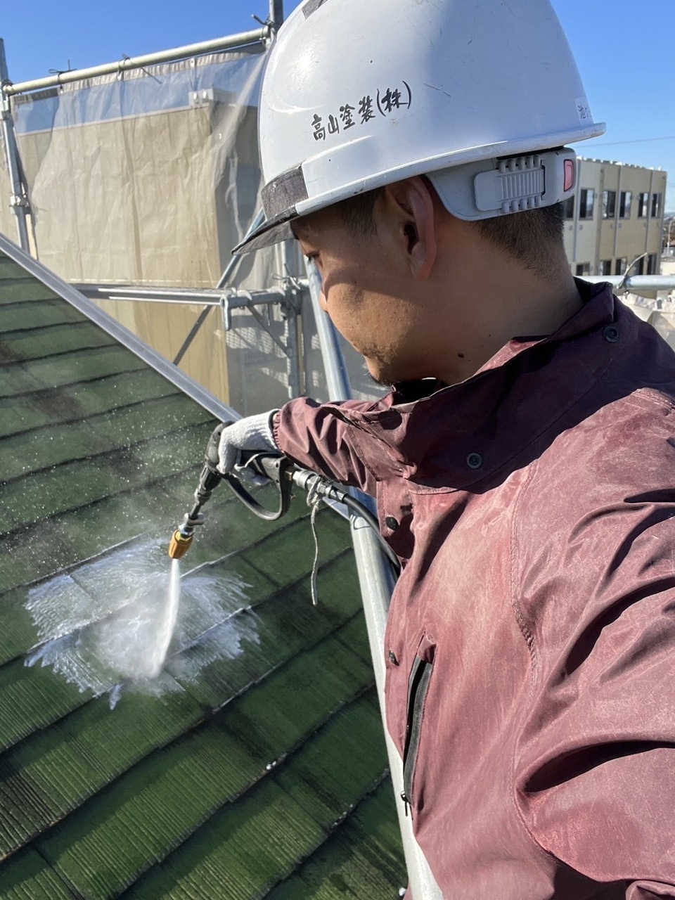 本日池ヶ谷の現場では屋根下塗り、各部下塗り、社長の現場では洗浄を行いました。