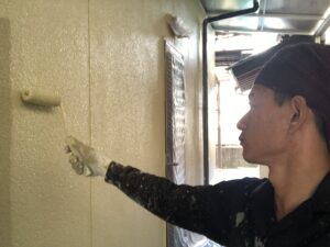 本日池ヶ谷の現場では物置倉庫塗装、社長の現場では各部塗装、私の現場ではベランダ軒天上裏塗装を行いました。