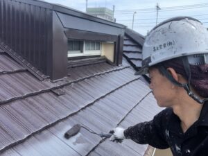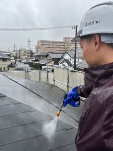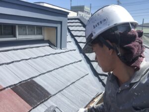 本日池ヶ谷の現場では各部塗装、養生、社長の現場では各部塗装、私の現場では屋根中塗りを行いました。