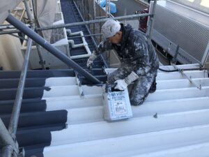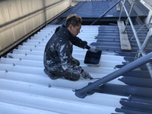 本日私の現場では下屋根上塗り、各部塗装、基礎上塗り、シート防水トップコートを行いました。