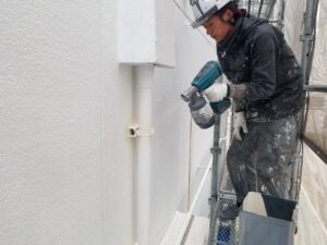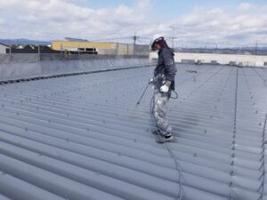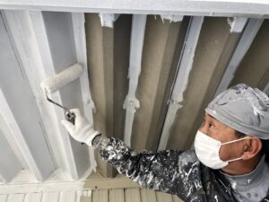 本日私の現場では折半上裏塗装、外壁上塗り、各部塗装を行いました。