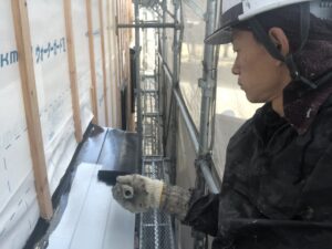 本日社長の現場では塗装まとめ、私の現場では養生、軒天木部塗装、外壁下塗り、各部塗装を行いました。
