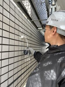 本日池ヶ谷の現場では養生、タイル部下塗り、社長の現場では洗浄、私の現場では外壁中塗り、各部塗装を行いました。